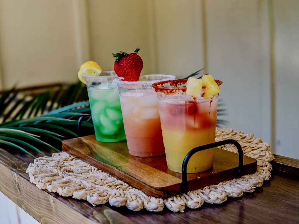 The three different beverage services offered are: cocktails, aguas frescas (served in barrel containers), and non-alcoholic flavored beverages.
